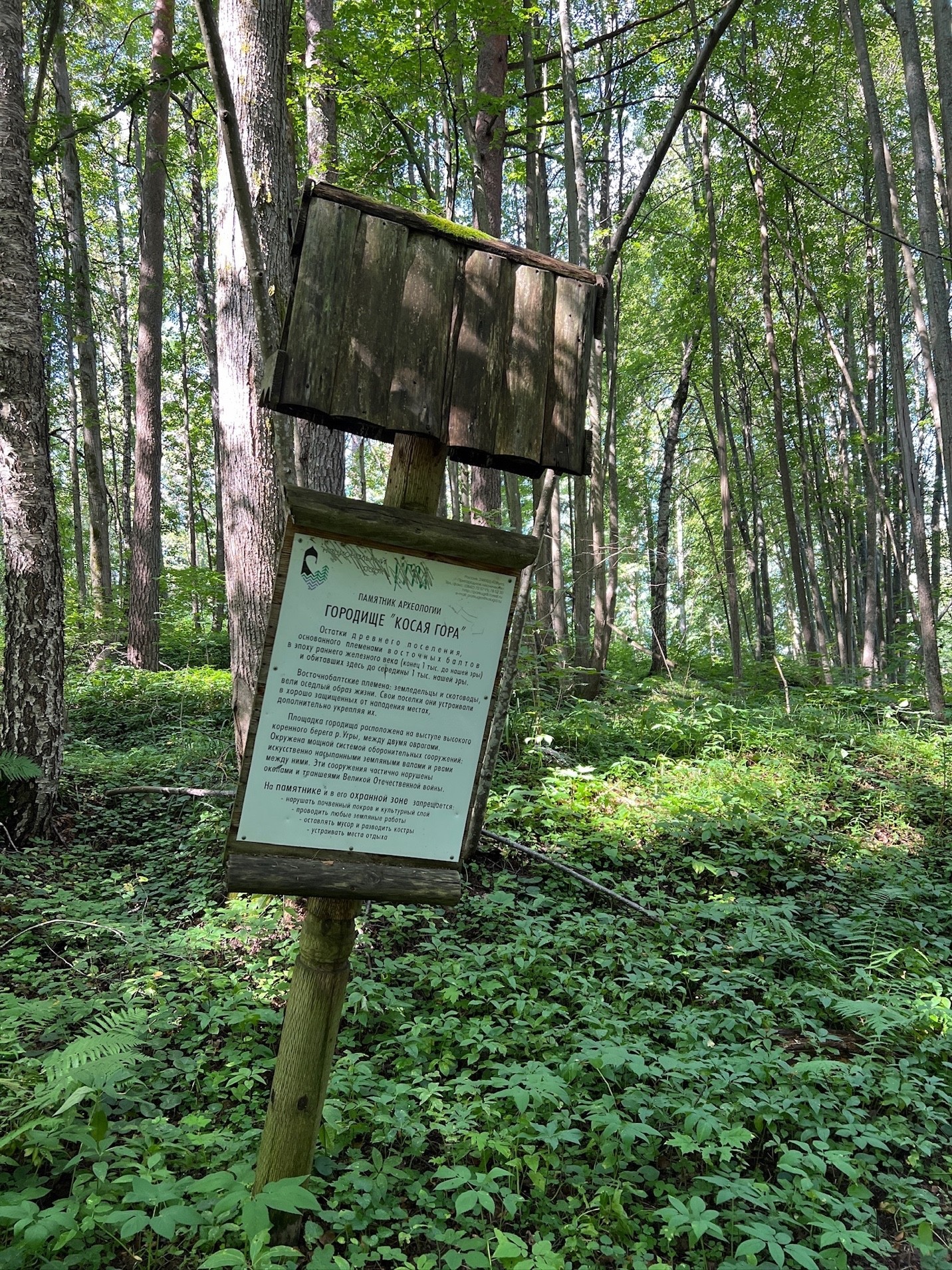 0 км. Тропы. Городище Александровское и 8 км. Тропы. ГОРОДИЩЕ "КОСАЯ ГОРА" - Остатки древних поселений, основанного племенами восточных балтов в эпоху раннего железного века (конец 1 тыс. до нашей эры) и обитавших здесь до середины 1 тыс. нашей эры. Восточнобалтские племена: земледельцы и скотоводы, вели оседлый образ жизни. Свои поселки они устраивали в хорошо защищенных от нападения местах, дополнительно укрепляя их. Площадка городища расположена на выступе высокого берега р. Угры. Окружена мощной системой оборонительных сооружений: искусственно насыпанными земляными волами и рвами между ними. Эти сооружения частично нарушены окопами и траншеями Великой Отечественной войны.
