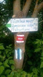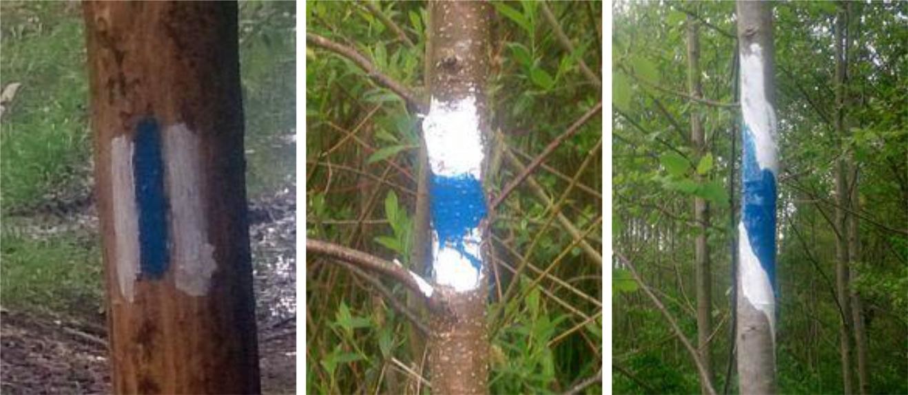 деревьях, красно-белые таблички RUTRAIL. Как правило, маркировки