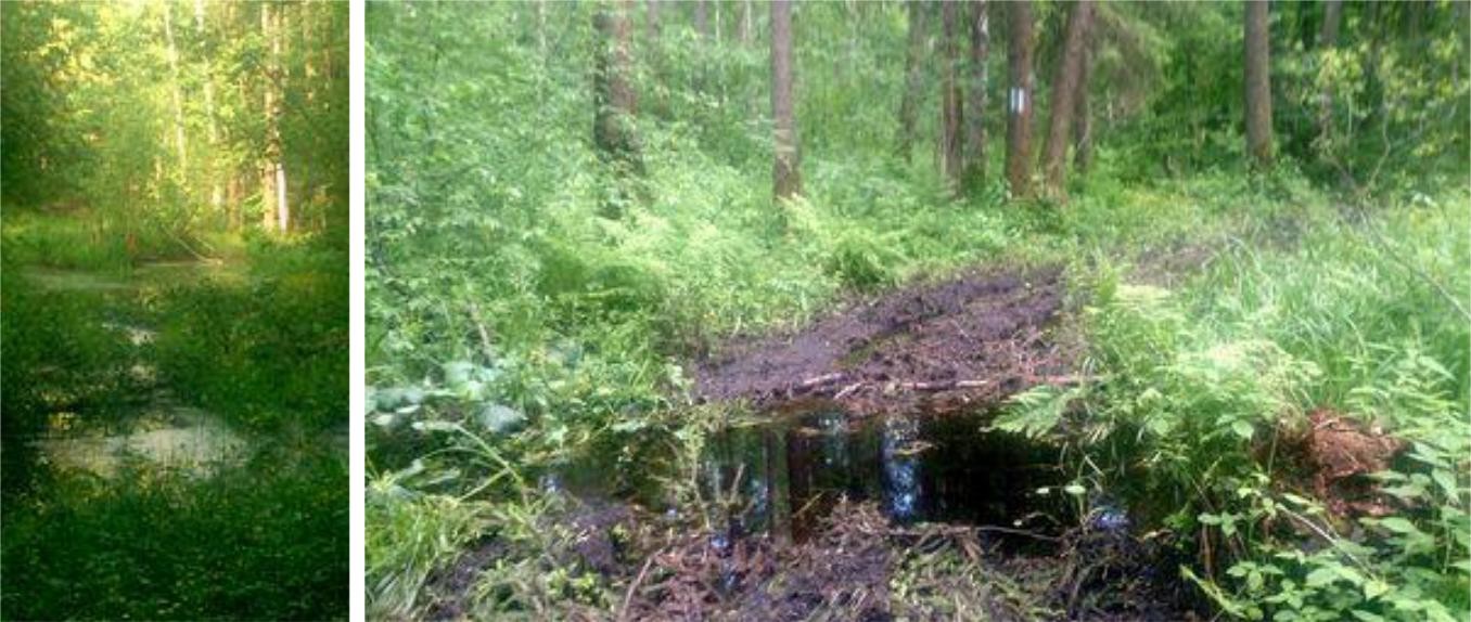 заболоченную пойму ручья. Впереди вода. Нам направо. Далее дорога