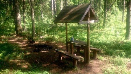 Есть стол со скамейками. В октябре 2015 года через эту поляну