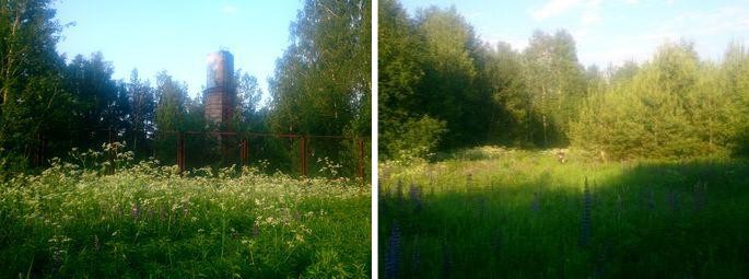 пионерлагеря Маяк. Нам налево, на луг, параллельно забору лагеря,