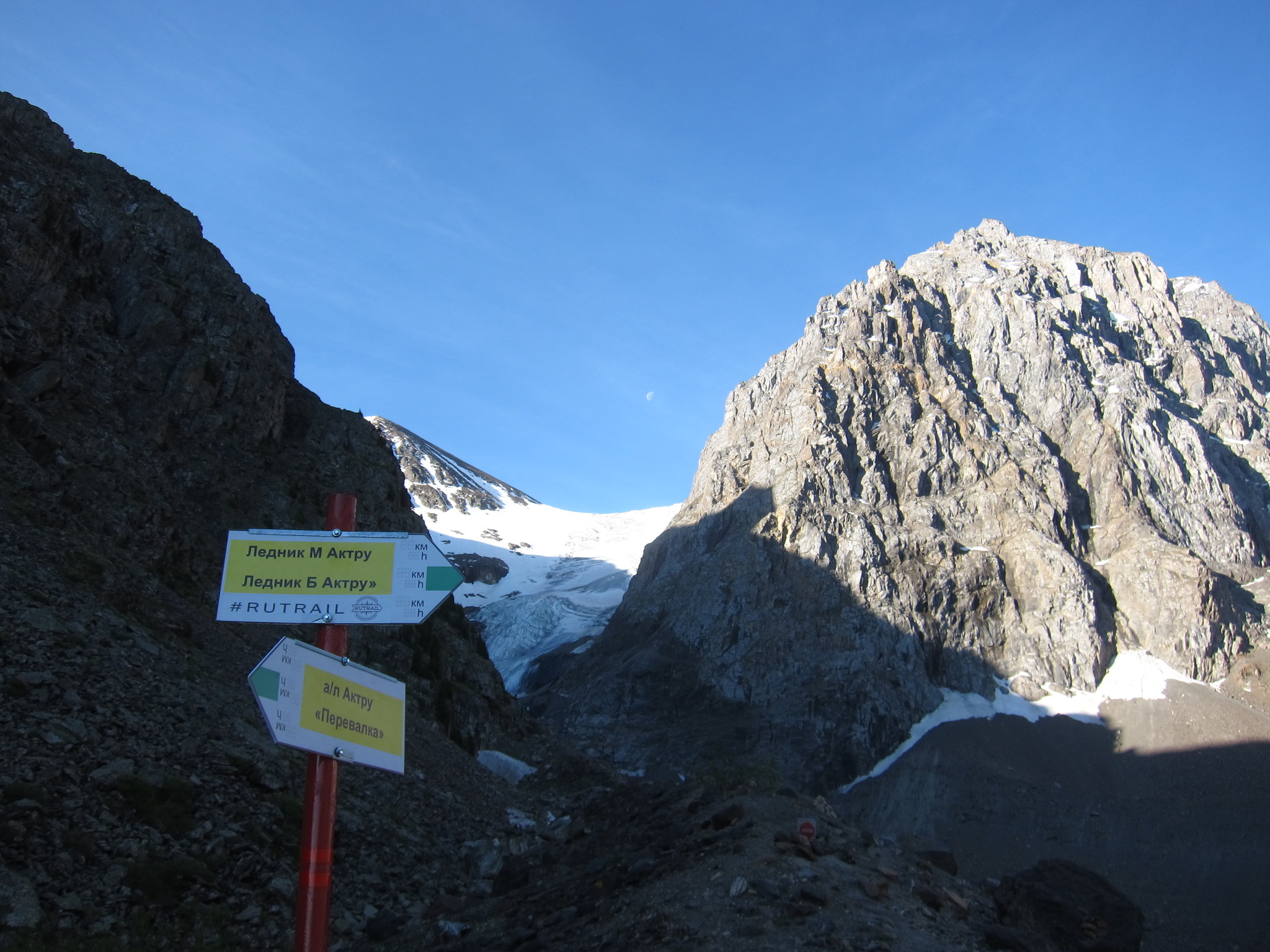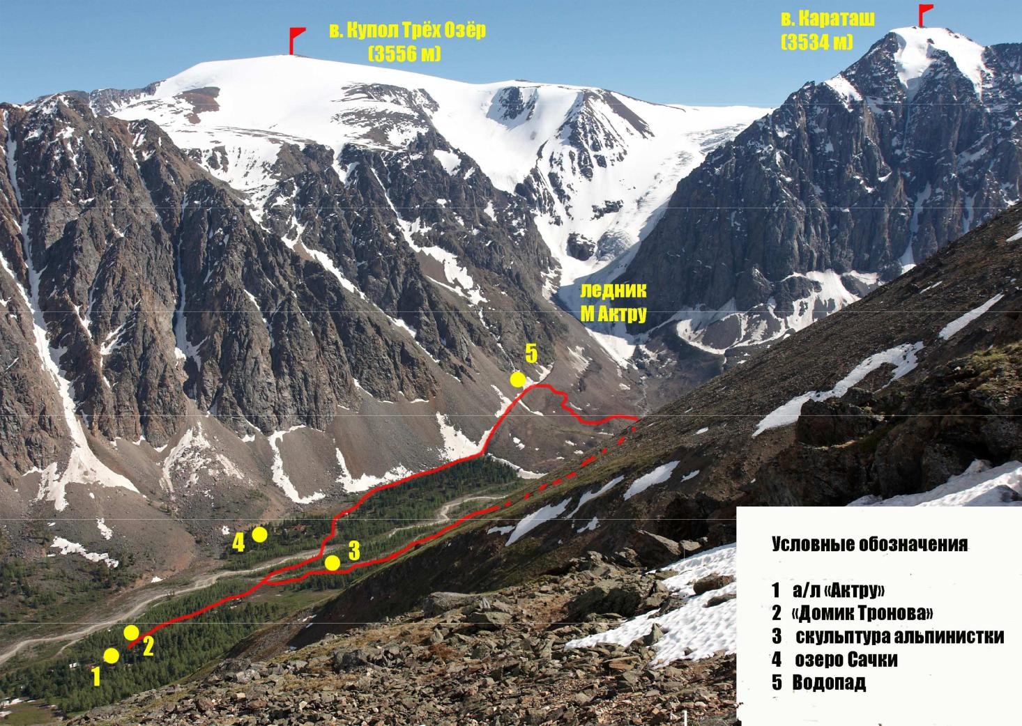 Тропа идет по склону морены до выполаживания под языком ледника Малый Актру. От ледника вниз вдоль реки, пересекая ручьи, тропа выводит к мосту через речку Большая Актру, чуть ниже места впадения в нее Малой Актру.