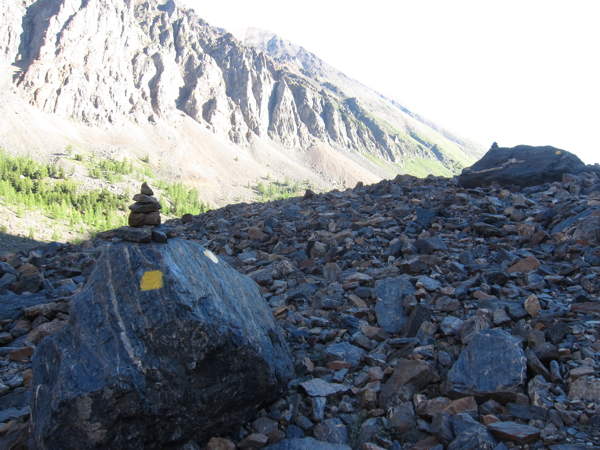 Путь по тропе промаркирован краской. Нанесены знаки в виде желтого прямоугольника.